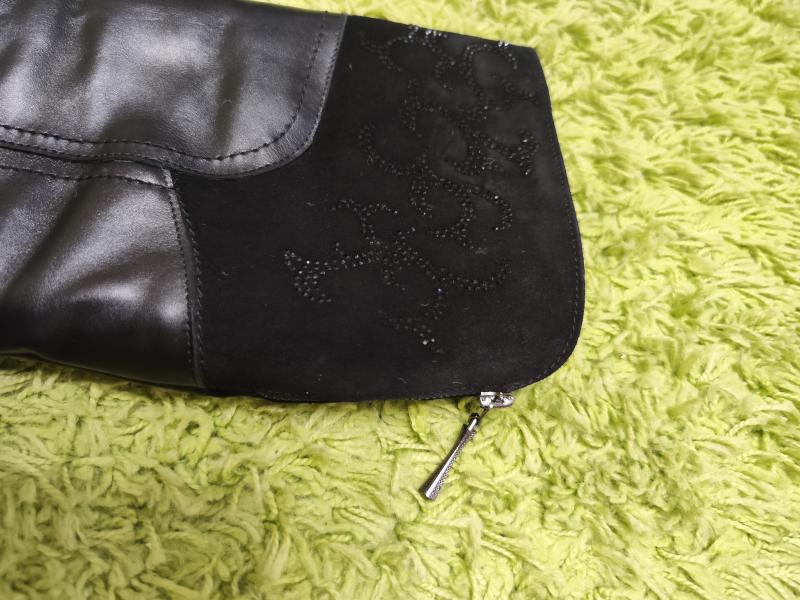 Верх голенища украшен декоративной отделкой, есть молния для увеличения объёма голенища сапога